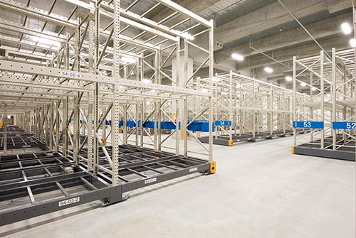 保管スペースのレイアウト変更にも便利なレールレスタイプの電動式パレットラック。粉塵の削減や工期の短縮といったメリットがあります。