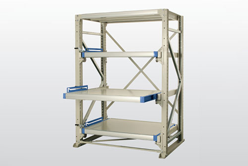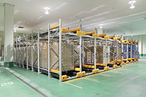 先入れ・先出し、先入れ・後出しの二つの用途に利用可能な水平流動ラック。品種別、出荷先別に仕分けしながらの流動的な保管にも最適です。