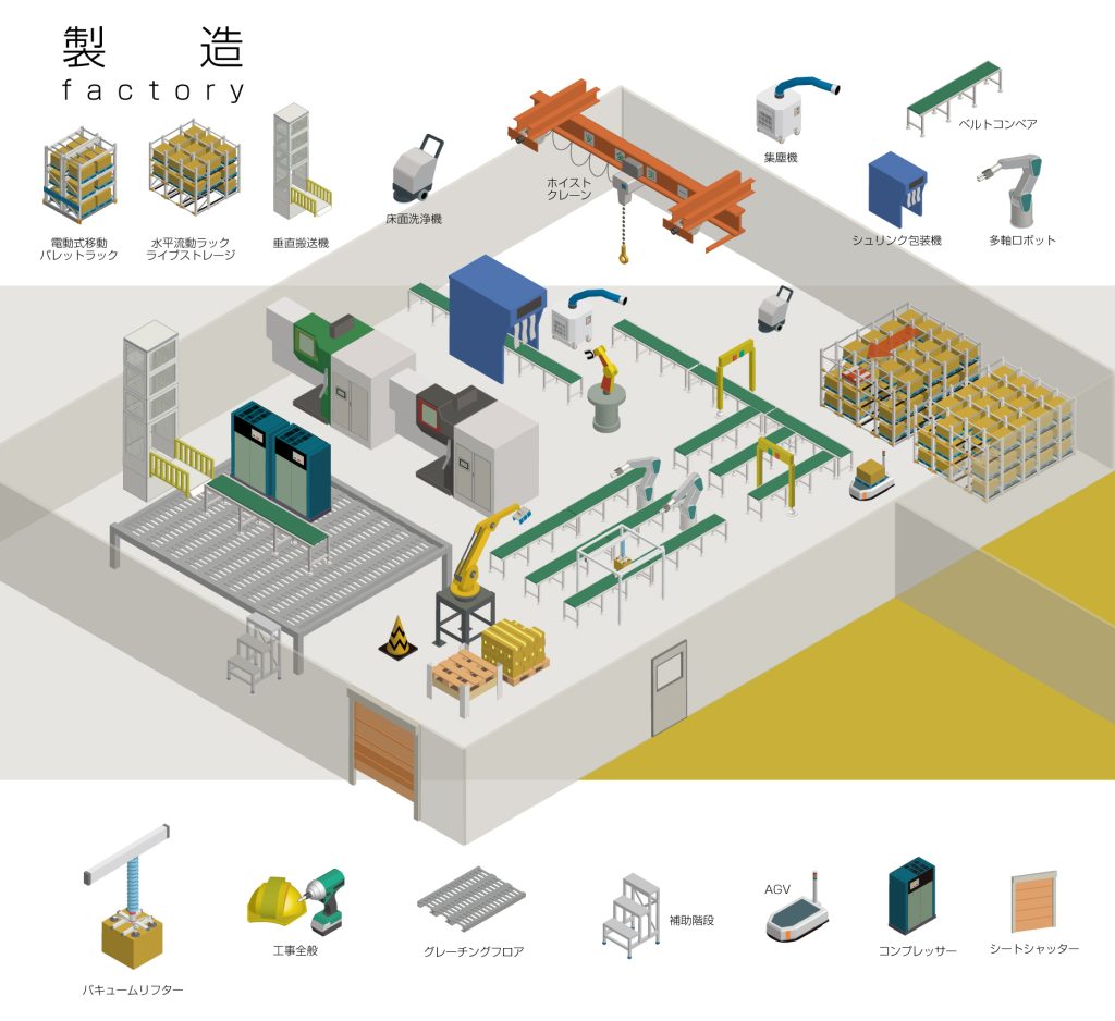 製造ラインから製品の一時保管、出荷作業場所として、需給調整機能を担う工場および倉庫では、限られたスペースの有効活用と、迅速な仕分け・出荷作業を可能な限りオートメーション化することで業務の省人化に貢献します。