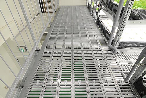 積層構造を形成する鋼製床材には、通気性に優れたグレーチングタイプや台車の走行がスムーズなフラットタイプなどがあります。